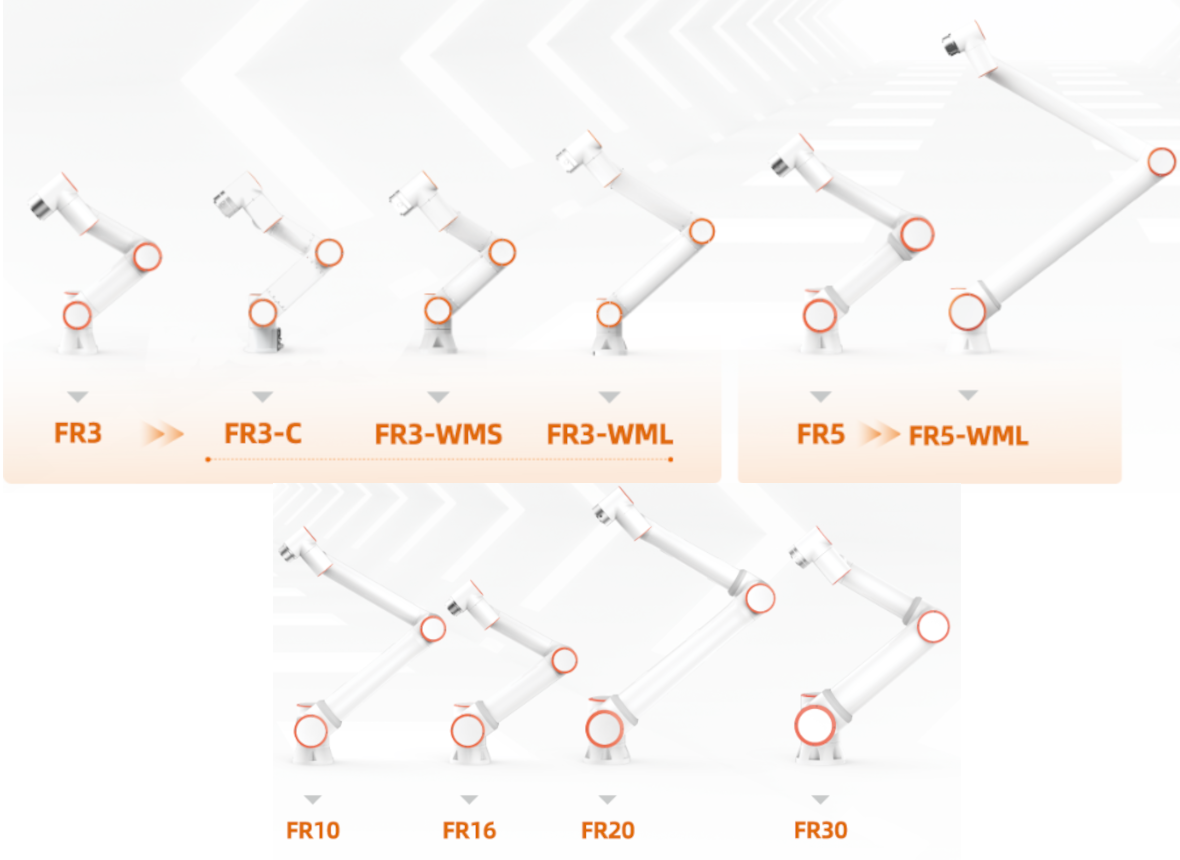 FAIRINOロボット製品ラインには、ペイロードと動作範囲の違いに応じて、6つのモデルがあります。